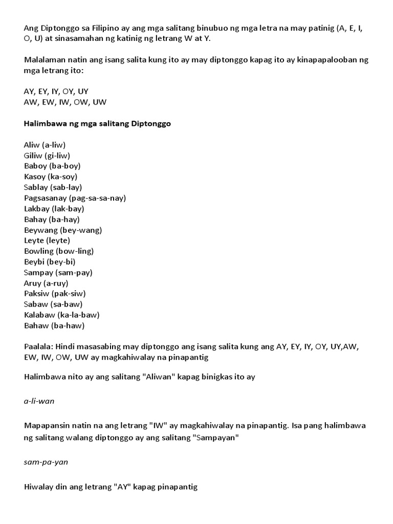 11152013 View Notes - Mga halimbawa ng mga salitang may diptonggo from ACCOUNTING bsa at Bassett High. 822013 This post is dedicated to Helen who requested for worksheets on kambal-katinig consonant cluster and diptonggo diphthong. Halimbawa ay -ow -ey -uy -ay -iw -aw at -oy.